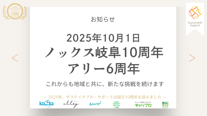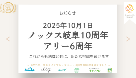 サステイナブル・サポートは、2015年10月1日に開所した就労移行支援事業所ノックス岐阜をはじまりとして、このたび活動開始10周年を迎えました。また、就労継続支援B型アリーも6周年を迎えることができました。