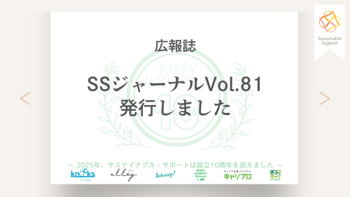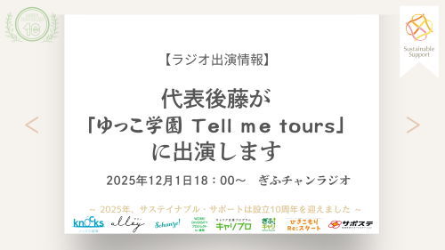 【イベント登壇のお知らせ】 もっと見る 代表後藤が岐阜放送「ゆっこ学園 Tell me tours ~輝光との旅~」出演します【12/1放送】 もっと見る 「ひきこもり Re:スタート」専用サイトをオープンしました! もっと見る 坂口捺染様 × 伊藤園様 自販機による支援プロジェクトがスタート! もっと見る 広報誌《SS JOURNAL》Vol.81発行のお知らせ もっと見る ノックス岐阜 「就労選択支援」開始します もっと見る