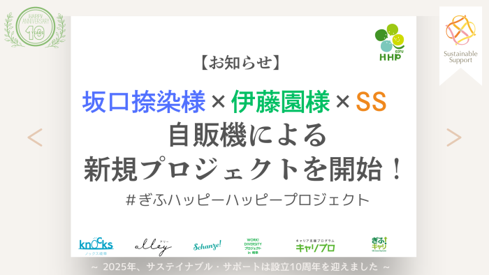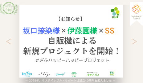本取り組みは、岐阜ハッピーハッピープロジェクトの一環として実施されています。 坂口捺染様には、2022年より、一般社団法人サステイナブル・サポートが運営する若者の居場所事業「ぎふキャリ」へ、継続的なご支援をいただいております。